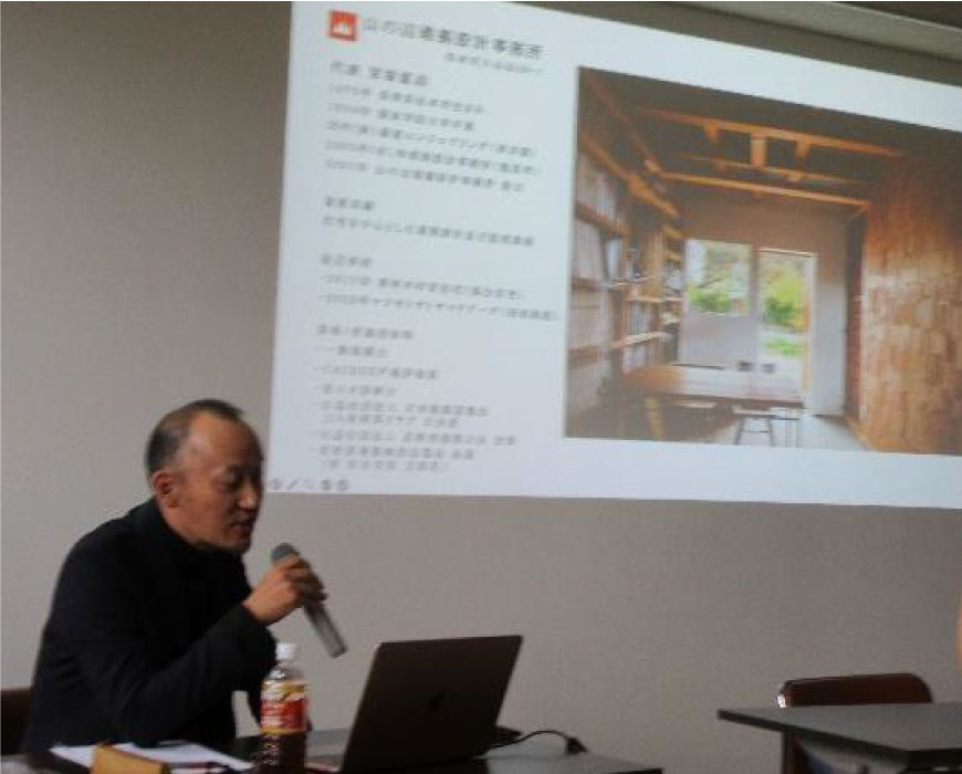 最初に役場会議室で、役場農林係で地域林政アドバイザーの岩間昇氏から建設までの経過説明があり、その後、設計担当の山の辺建築設計事務所(松本市山辺)の代表宮坂直志氏より、町営住宅設計にあたっての留意点の説明を受けました。