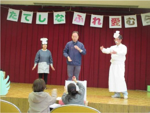 後、開村式は福祉センターの中に移り、手話の会の手話劇、「立科のコメを守れ」、保育園児の歌、立科小学校合唱部の歌があり、お昼に。