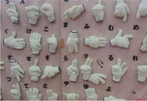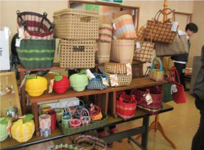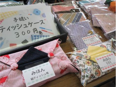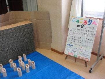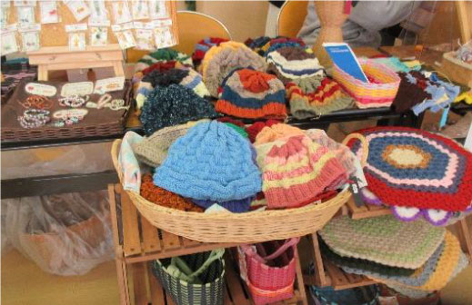 会場には手話の会の手話が軍手を使って音を表した展示、コロコロリンの会主催の木の棒を投げて木製のピンを倒して得点数を争うモックルという競技、福祉団体のみなさんの手作り品の数々。