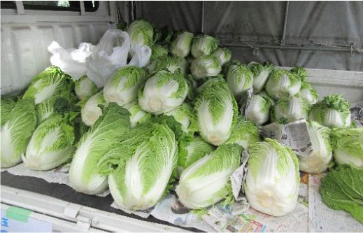 ふれあい園のみなさんが畑で作った白菜。軽トラの荷台で販売。