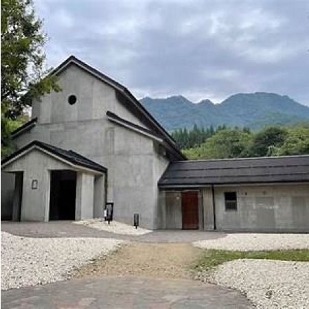 上から見ると十字架の形をしている「無言館」の入り口に「佐久地域後援会の旗」が置かれた。