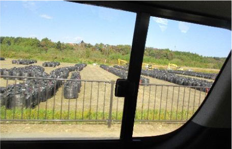 【マイクロバスの車窓から】除染した土を入れた黒いフレコンバッグ。