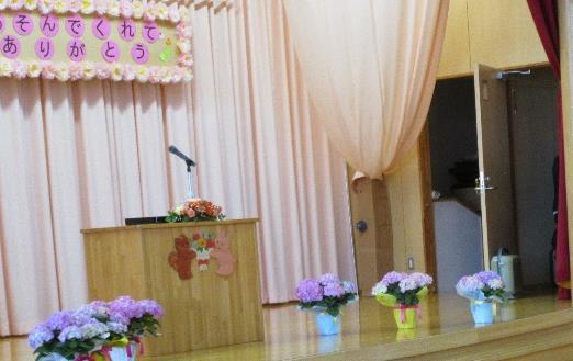 来賓として参列しました。色とりどりの花の鉢で飾られ、文字通りの花道を通って入場した卒園生。