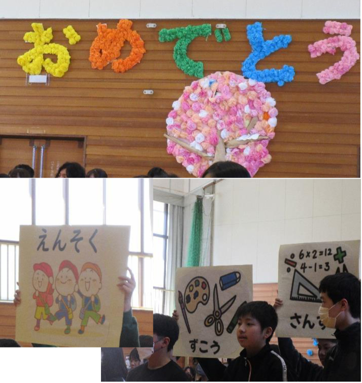 会場は在校生に手になるものでしょうか、お花紙で「おめでとう」とお祝いの言葉が後ろの壁にかかり気持ちが伝わります。