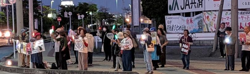 名護の手作りスタンディング。子連れのお母さんら60人ほどが参加。もと県会議員の具志堅さんや名護市会議員2名、高齢者も数人でした。男女交互に短いスピーチ。最後は皆で歌い、海難事故犠牲者に黙祷を捧げました。Kさんもペンライトを持って参加してました。